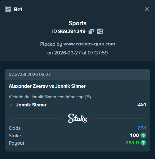 - Apuesta principal: Victoria de Jannik Sinner con hándicap (-5) a cuota de 2.51.