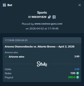 Victoria de Arizona Diamondbacks. Apuesta Principal: Arizona gana.