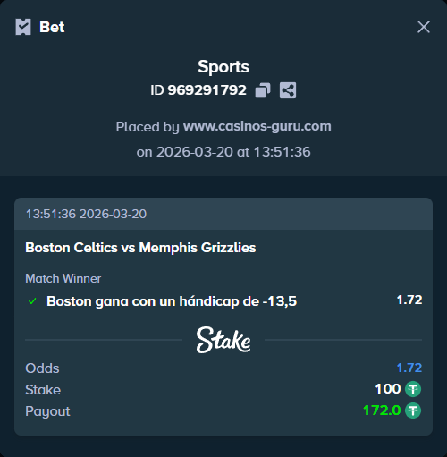 - Apuesta principal: Boston gana con un hándicap de -13,5 a una cuota de 1,72.