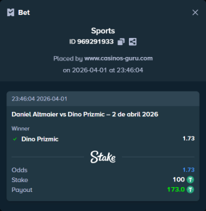 Basado en el análisis de ambos jugadores, creemos que Dino Prizmic es el favorito para ganar este enfrentamiento. Su estilo de juego rápido y su excelente adaptación a la tierra batida le dan una ventaja clara sobre Altmaier, que mostró debilidades contra oponentes más ágiles.