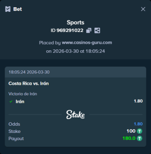 | Casa de Apuestas | P1 (Costa Rica) | Empate | P2 (Irán) | Más de 2.5 goles | Menos de 2.5 goles | Bonos |