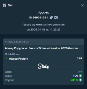 Basándonos en la reciente exhibición de Popyrin, especialmente su mejorado juego al resto y su agresividad, creemos que tiene una excelente oportunidad de vencer a Tiafoe. La cuota de 2.81 para su victoria es atractiva.