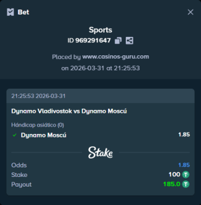 Hándicap asiático (0) a favor de Dynamo Moscú – cuota 1,85. Los visitantes tienen mejor forma y motivación, lo que los convierte en favoritos claros.