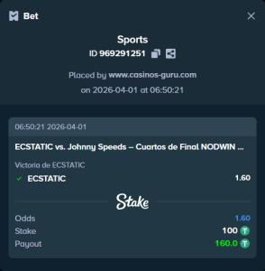 Las casas de apuestas favorecen a ECSTATIC con cuotas de 1.60, mientras que Johnny Speeds se sitúa en 2.20. El total de más de 52.5 rondas se paga a 1.84, y el total de menos a 1.92.