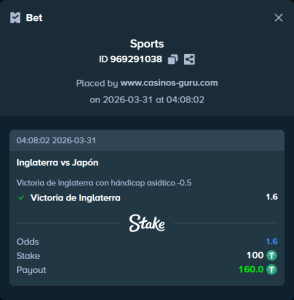 El hándicap asiático -0.5 para Inglaterra significa que para que la apuesta sea ganadora, Inglaterra debe ganar el partido por al menos un gol de diferencia. Si el partido termina en empate o victoria de Japón, la apuesta se considera perdida.