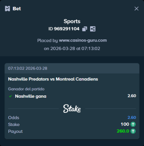 La casa de apuestas ha establecido cuotas de 2.60 para Nashville y 2.30 para Montreal. Aquí hay algunas sugerencias de apuesta: