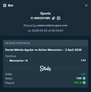 En base a las estadísticas y el análisis, recomendamos apostar a favor de Adrian Mannarino con un hándicap de +4. Aunque Mérida Aguilar es el favorito, su desgaste físico reciente podría abrir una puerta para que Mannarino aproveche la situación. Las probabilidades de que el francés no pierda por un margen amplio son altas, por lo que el hándicap de +4 es una apuesta interesante.