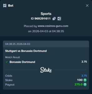 Las probabilidades de éxito del Dortmund son 2,75. Victoria de Konstantin Ulanov para el Borussia Dortmund 2,75. Realiza una apuesta. ¿Te gustó el pronóstico del autor? 0% 0 votos 0% Sé el primero en calificar.