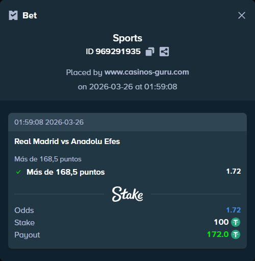 Más de 168,5 puntos a cuota 1,72. Dado el estilo ofensivo del Real Madrid y la necesidad del Anadolu Efes de jugar sin presión, es probable que ambos equipos superen este total.