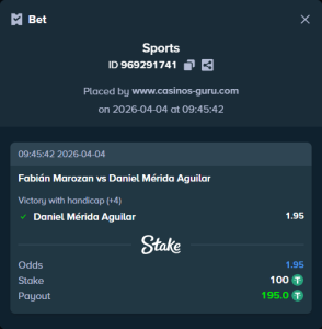 El hándicap (+4) para Daniel Mérida Aguilar significa que, para que la apuesta sea ganadora, él debe ganar el partido o perderlo por una diferencia de no más de 3 juegos. Por ejemplo, si el resultado final es 6-4, 6-4 (dos sets a cero para Marozan), la suma total de juegos ganados por Mérida Aguilar sería 8, y por Marozan 12. La diferencia es de 4 juegos. En este caso, la apuesta con hándicap (+4) para Mérida Aguilar sería ganadora. Si el resultado fuera 6-2, 6-2, la diferencia sería de 8 juegos, y la apuesta con hándicap (+4) para Mérida Aguilar sería perdedora.